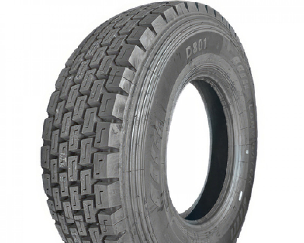 Рисунок протектора D801 — симетричний блочно-щілинний, побудований з масивних тягових шашок, з’єднаних перемичками для рівномірного розподілу тиску. Поздовжні канавки середньої ширини формують безперервні канали для відведення води, а поперечні прорізи створюють додаткові кромки зачеплення, що покращує старт на слизьких ділянках. Крок блоків підібраний так, щоб поєднати тягу на малих швидкостях із зниженим шумом на крейсерських режимах.